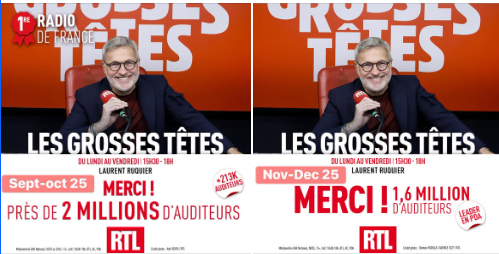 Premièrement, on remarque que le chiffre « 2 millions » est affiché en caractères bien plus imposants que le « 1,6 million » de la vague précédente. En septembre-octobre, la communication mettait en avant le nombre d’auditeurs gagnés (+213 000). Cette fois-ci, RTL insiste uniquement sur le fait d’être leader en part d’audience. La comparaison de ces deux campagnes est particulièrement éclairante : car même lorsque les audiences sont mauvaises, la chaîne doit absolument montrer que tout va bien. Cette forme d’hypocrisie communicationnelle est à la fois amusante et très révélatrice